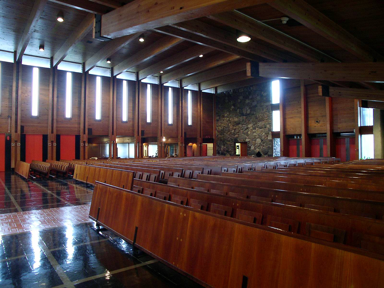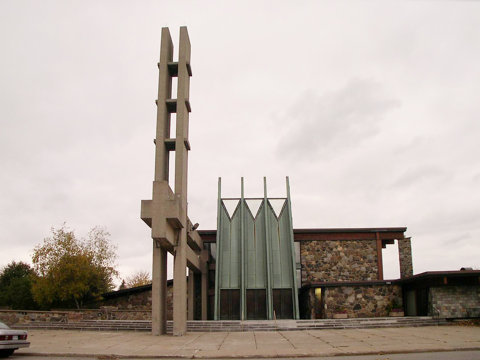 Construite entre 1961 et 1962, l’église Saint-Maurice-de-Duvernay est un remarquable exemple d’architecture religieuse moderne située au cœur d’un quartier résidentiel de Laval. Son design audacieux se distingue par une nef surmontée d’une imposante poutre en béton, de type en échelle, qui traverse l’espace et se prolonge à l’extérieur pour former un clocher élancé à double structure verticale. L’édifice adopte un plan rectangulaire avec un unique bas-côté à l’ouest et une façade orientée vers le sud, marquée par une section centrale en cuivre percée de trois portes. Les matériaux bruts comme le béton, la pierre non taillée et le verre donnent à l’ensemble une apparence à la fois robuste et épurée, tandis que des vitraux abstraits viennent animer la lumière à travers la structure.